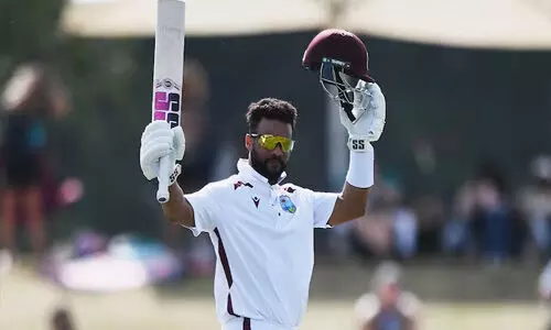 న్యూజిలాండ్తో జరుగుతున్న తొలి టెస్టులో పర్యాటక వెస్టిండీస్ టీమ్ పోరాడుతోంది. భారీ లక్షంతో బ్యాటింగ్కు దిగిన విండీస్ శుక్రవారం నాలుగో రోజు ఆట ముగిసే సమయానికి 4 వికెట్ల నష్టానికి 214 పరుగులు చేసింది. ఈ మ్యాచ్లో విజయం సాధించాలంటే చివరి రోజు విండీస్ మరో 319 పరుగులు చేయాలి. క్లిష్టమైన లక్షంతో బ్యాటింగ్ చేపట్టిన విండీస్కు ఆరంభంలోనే షాక్ తగిలింది. ఓపెనర్లు చందర్పాల్ (6), జాన్ కాంప్బెల్ (15) విఫలమయ్యారు. వన్డౌన్లో వచ్చిన అథనాజె (5), కెప్టెన్ రోస్టన్ ఛేజ్ (4) కూడా నిరాశ పరిచారు. దీంతో విండీస్ 72 పరుగులకే నాలుగు వికెట్లను కోల్పోయింది. ఈ దశలోఇన్నింగ్స్ను ముందుకు తీసుకెళ్లే బాధ్యతను షాప్ హోప్ తనపై వేసుకున్నాడు. అతనికి జస్టిన్ గ్రీవ్ 55(బ్యాటింగ్) అండగా నిలిచాడు. కీలక ఇన్నింగ్స్ ఆడిన హోప్ 15 ఫోర్లు, ఒక సిక్స్తో అజేయంగా 116 పరుగులు చేసి క్రీజులో ఉన్నాడు. అంతకుముందు కివీస్ రెండో ఇన్నింగ్స్లో 8 వికెట్ల నష్టానికి 466 పరుగులు చేసి డిక్లేర్డ్ చేసింది.