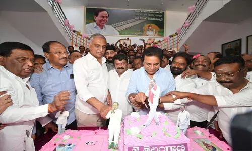 ఈ వేడుకల్లో పార్టీ వర్కింగ్ ప్రెసిడెంట్ కెటిఆర్, మాజీ మంత్రులు హరీష్రావు, తలసాని శ్రీనివాస్ యాదవ్ తదితర నేతలు పాల్గొన్నారు. ఈ సందర్భంగా 72 కిలోల కేక్ కట్ చేసి కెటిఆర్, హరీష్రావు ఒకరికొకరు తినిపించుకున్నారు. కెసిఆర్ ఉద్యమ ప్రస్థానం, పదేళ్ల పాలనపై తయారు చేసిన డాక్యుమెంటరీని ప్రదర్శించారు. ఈ వేడుకలలో పార్టీ ముఖ్యనేతలు, మాజీ మంత్రులు, ఎంఎల్ఎలు, ఎంఎల్సిలు పాల్గొన్నారు. ఈ సందర్భంగా కెటిఆర్ మాట్లాడుతూ ఇటీవల ఓ కార్యక్రమంలో సిఎం రేవంత్ రెడ్డి మాట్లాడుతూ, కెసిఆర్ది ఏ జాతి, ఎవరికి జాతిపిత అంటూ చేసిన వ్యాఖ్యలపై తీవ్రంగా స్పందించారు. “ఏ జాతి అనే అల్పుడికి నేను చెబుతున్నా.. రాజ్యతంత్రం నడిపిన రుద్రమ జాతి మాది.. జల్ జంగల్ జమీన్ అని కొట్లాడిన కొమురంభీం, అస్తిత్వం కోసం అమరులైన సమ్మక్క, సారక్క, కోటల మీద జెండా ఎగురవేసిన బహుజన వీరుడు సర్దార్ సర్వాయిపాపన్న, భూస్వాముల దోపిడి మీద కొట్లాడిన దొడ్డి కొమురయ్య, బరిలో బందూకు పట్టి దేశ్ముఖ్లను తరిమికొట్టిన వీరనారి చాకలి ఐలమ్మ, సామాజిక విప్లవకారుడు భాగ్యరెడ్డి వర్మ, సిపాయిల తిరుగుబాటు బావుటా ఎగురవేసిన తుర్రెబాజ్ ఖాన్, ప్రాంతం వాడు మోసం చేస్తే ప్రాంతంలోనే ఉప్పుపాతర వేస్తామన్న కాళేజీ, నా తెలంగాణ కోటి రతనాల అన్న దాశరథి, విద్యార్థి అమరవీరుల జాతి మాది” అని కెటిఆర్ ఉద్ఘాటించారు.