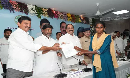 మన తెలంగాణ/ఖమ్మం బ్యూరో: వెలుగుమట్ల భూదాన భూమిలో నిరాశ్రయులైన నిరుపేదల కోసం దేశంలోని ఇతర రాష్ట్రాల వారు వచ్చి చూ సేలా ఆదర్శవంతమైన మోడల్ కాలనీ నిర్మిస్తామని డిప్యూటీ సీఎం మల్లు భట్టి విక్రమార్క తెలిపారు. భూదాన్ భూముల్లో అక్రమంగా నిర్మించిన ఇళ్ళను కూల్చడంతో నిరాశ్రయిలైన నిరుపేదలకు బుధవారం జిల్లా కలెక్టరేట్లో ఇళ్ళ పట్టాలతో పాటు ఇందిరమ్మ ఇళ్ళ మంజూరు పత్రాలను డిప్యూటీ సిఎం భట్టి విక్రమార్కతో పాటు మంత్రులు పొంగులేటి శ్రీనివాస్రెడ్డి, తుమ్మల నాగేశ్వర్రావు పంపిణీ చేశారు. భూదాన్ భూముల్లో పేదలకు ఇందిరమ్మ ఇల్లు నిర్మించి ఇవ్వడమే కాకుండా వారికి కావాల్సిన మౌలిక వసతులు కల్పిస్తామన్నారు. గురువారం నుంచే ఇందిరమ్మ ఇళ్ల నిర్మాణం ప్రారంభించి డిసెంబర్ 9న సోనియాగాంధి జన్మదినోత్సవం నాటికి మోడల్ కాలనీని నిర్మించి ముఖ్యమంత్రి రేవంత్ రెడ్డి చేతుల మీదుగా ప్రారంభింపజేస్తామని చెప్పారు .